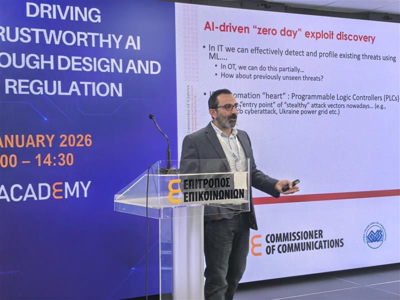 Prof. Angelos Marnerides presented COCOON’s AI-driven Critical Infrastructure security at Cyprus’s “Driving Trustworthy AI through Design and Regulation” event. He demonstrated the Programmable Node protecting interconnected power grids, showcasing practical AI resilience at national scale.